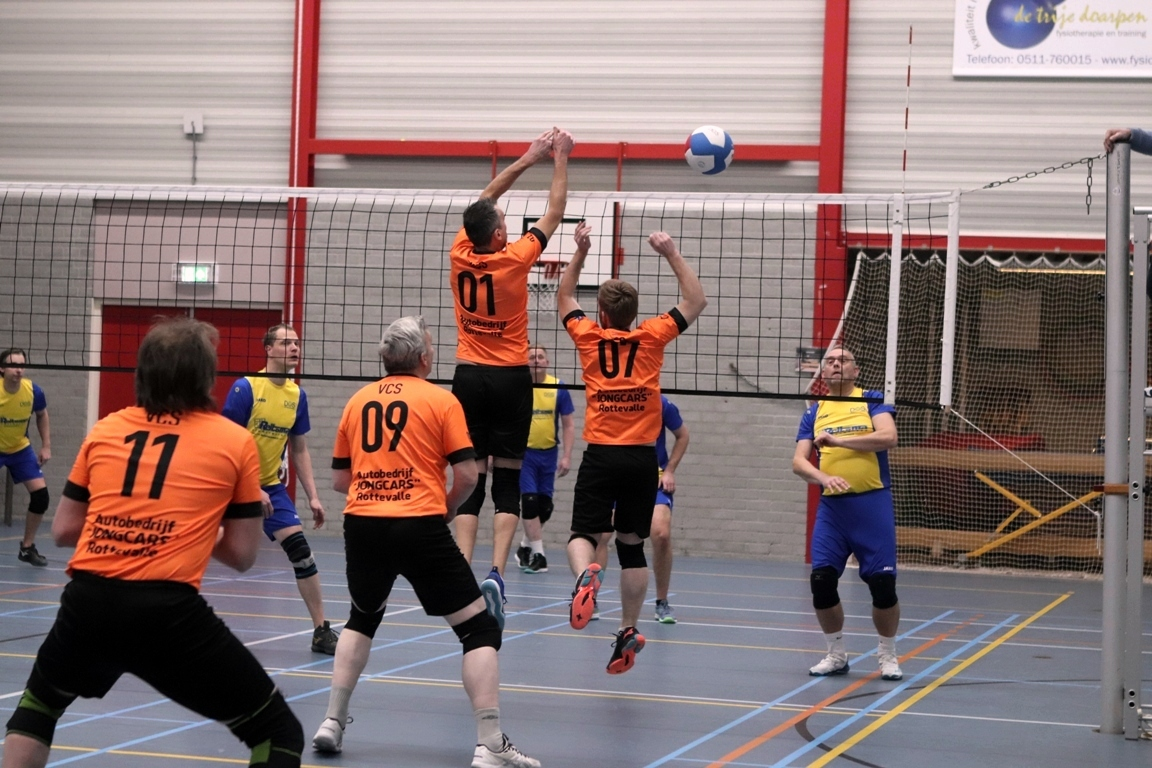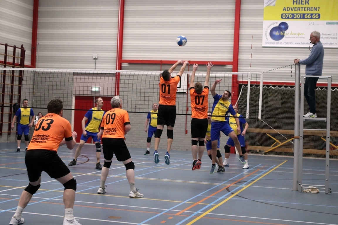 Coach Jan Zijlstra wilde gaan voor zekerheid en begon daarom met Luca van der Heide, Kees Kloosterman, Peter Wolters, Douwe Kooistra, Gerrit de Beer en Cornelis van Slageren in de basis en met Jelmer van der Heide en zichzelf op bank. De zes spelers konden de verwachtingen echter niet waarmaken. Vanaf het eerste fluitsignaal van scheidsrechter Jan van Slageren speelden zij ongeconcentreerd en lieten ze VCS simpel in de wedstrijd komen. De lange midspeler van VCS kreeg door de trage blokkering alle ruimte om aan te vallen en zo leek een verrassing in de maak. Maar de thuisploeg kreeg de motor toch aan de praat en nam halverwege de set het heft in handen. Er werd een 22-19 voorsprong genomen, maar die verdween door een fout in de verdediging in het achterveld en de daaropvolgende serviceserie van de Feansters als sneeuw voor de zon. Het werd een nek aan nek-race, waarin om en om een voorsprong werd genomen. Uiteindelijk waren de gasten net iets beter bij de les.